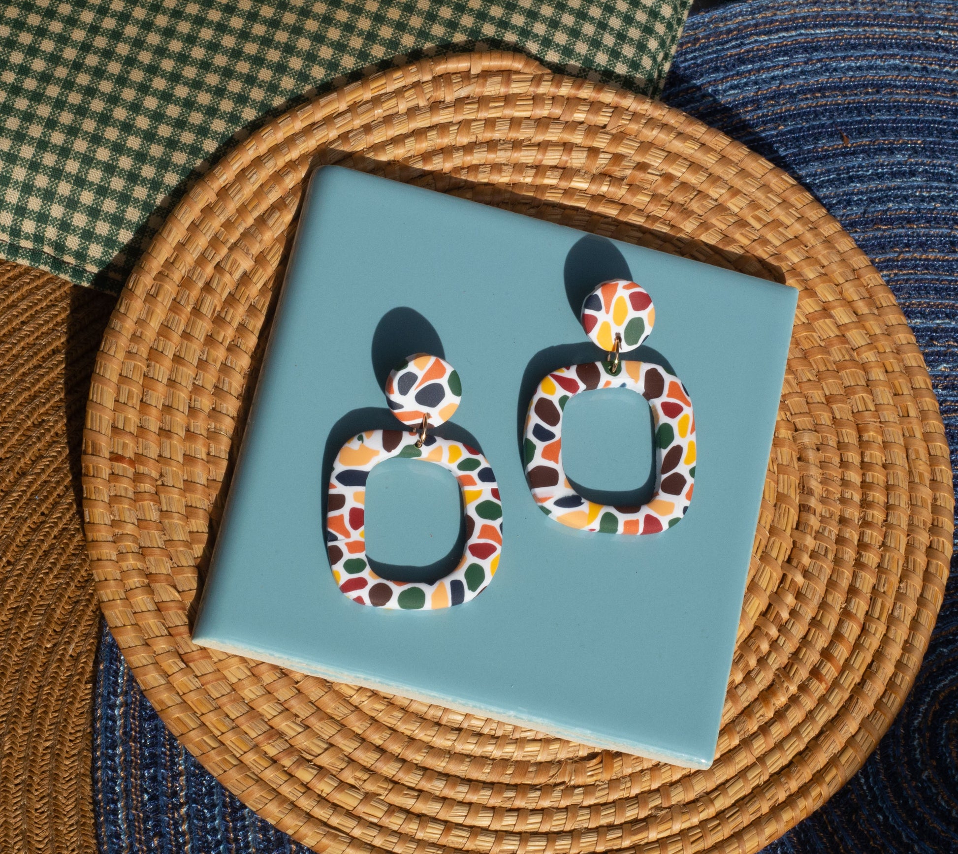 Earthy colored pebbles dance across these earrings in three styles -- a funky dangle earring, a large chunky stud, and a small stud.