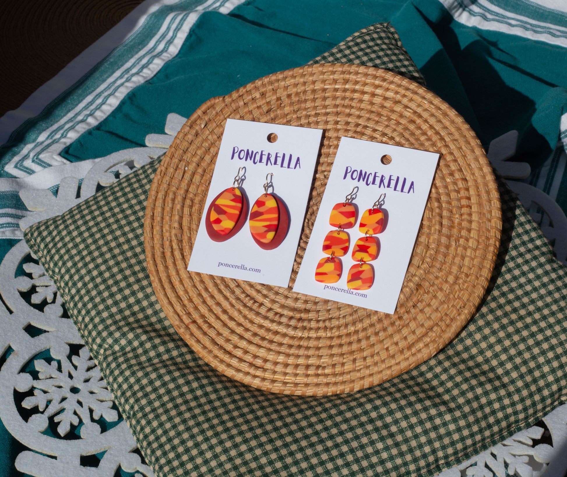 Fall leaves inspired these vibrantly colored drop earrings! Choose from two shapes, one with three abstract shapes in a drop earring, one with a deep red backing the leaf whirlwind.